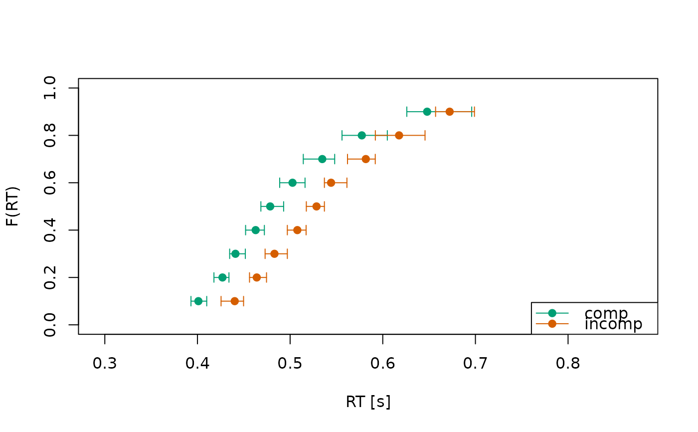 Visualizes response time quantiles for observed and/or predicted data across experimental conditions. This is useful for assessing model fit or exploring response patterns across conditions or participants.